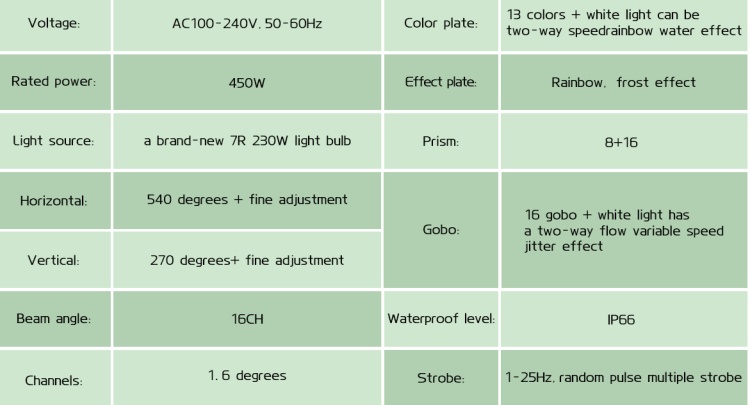 Pattern: 16 patterns + white light has a two-way flow, variable speed jitter effect