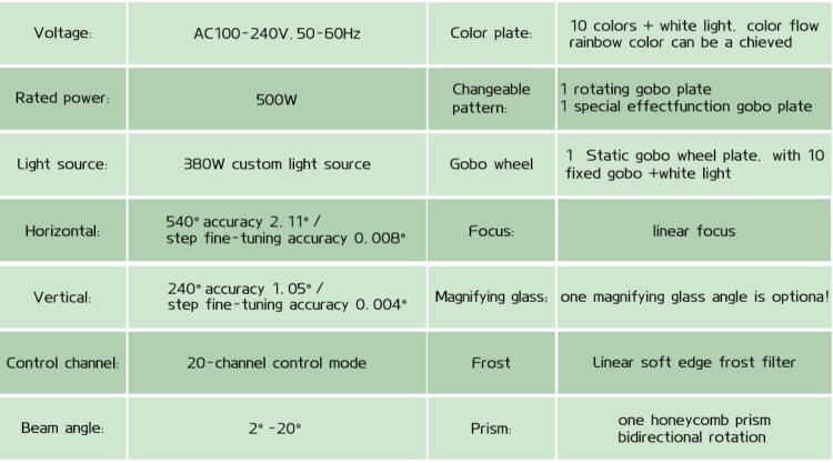 Control mode: DMX512. Master-slave, self-propelled, voice control